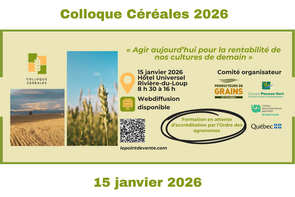 Les Producteurs de grains de l'Est du Québec et Groupe Pousse-Vert sont heureux de vous convier à la 10e édition du Colloque céréales qui se tiendra le 15 janvier 2026 à Rivière-du-Loup et en webdiffusion individuelle.