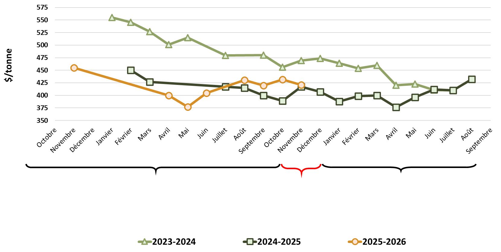 Les années récoltes analysées sont les suivantes : celle qui est récemment complétée; celle qui est récoltée, mais qui n’est pas totalement commercialisée; et celle qui n’est pas encore semée. La barre du temps couvre la période « avant récolte », « récolte » et « après récolte », pour chacune des années récoltes, car la commercialisation des grains peut s’échelonner sur 24 mois. Par conséquent, un même mois survient deux fois dans la ligne du temps. De plus, un même mois sera associé à une année différente selon l'année récolte analysée: par exemple, le mois d’octobre durant la période « récolte » a lieu en 2021 pour l'année récolte 2021-2022 et en 2022 pour l'année récolte 2022-2023. Finalement, les prix sont des prix moyens pondérés qui ont été conclus durant le mois pour une livraison qui aura lieu pendant l’année récolte.
