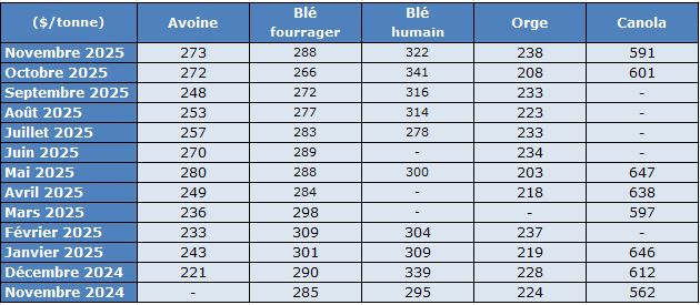 Le tableau suivant indique l’évolution du prix courant des céréales et de celui du canola au cours des derniers mois. En consultant directement les diffusions du marché local, vous pourrez observer les prix minimums et les maximums.