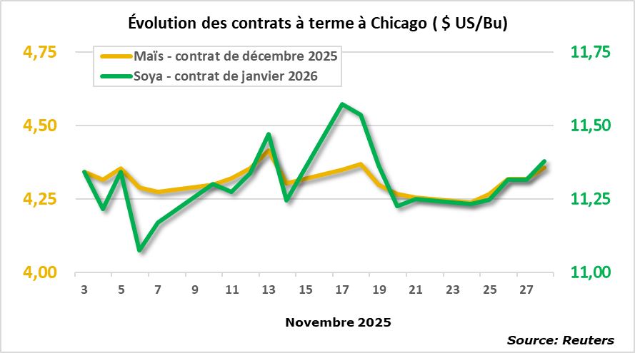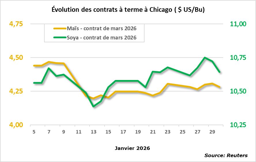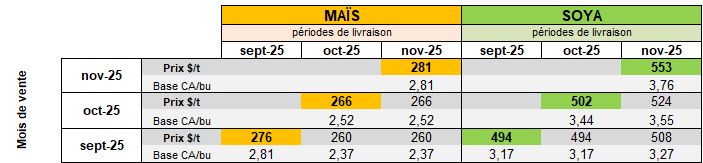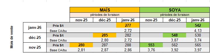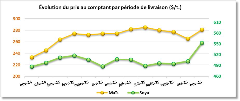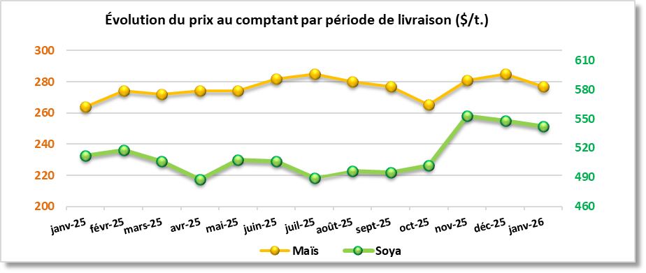 Le tableau et le graphique suivants présentent l'évolution du prix au comptant du maïs et du soya par période de livraison.