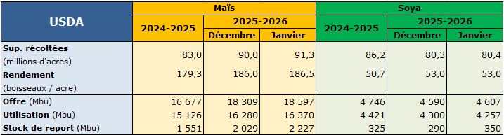 Les ventes à l’exportation se sont nettement améliorées depuis les derniers mois, particulièrement pour le soya, en raison des achats effectués par la Chine au cours des dernières semaines. Au 22 janvier 2026, la Chine avait officiellement acheté 9,65 Mt de soya pour 2025-2026, une quantité inférieure à l’objectif vanté par l’administration américaine de 12 Mt. Néanmoins, les marchés ne se soucient guère du manque à gagner et réagissent comme s’il était atteint. D’ailleurs, seules les compagnies étatiques chinoises achètent la fève de soya américaine, car celle-ci demeure plus dispendieuse que celles du Brésil, notamment en raison d’un écart significatif entre le tarif sur les importations du Brésil à 3 % et celles des États-Unis à 13 %.