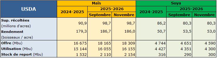 Sur l’échiquier mondial, en 2024-2025, l’USDA a redressé la production de 2,5 Mt au Brésil à 171,5 Mt et de 0,21 Mt en Argentine à 51,11 Mt, ainsi que les importations chinoises de 1,5 Mt à 108 Mt. En 2025-2026, les exportations de soya ont augmenté de 0,5 Mt pour le Brésil et de 2,25 Mt pour l’Argentine alors que la consommation de cette dernière s’est inclinée de 1,7 Mt en raison des ventes à la Chine. Les stocks mondiaux ont alors été réduits de 2 Mt.