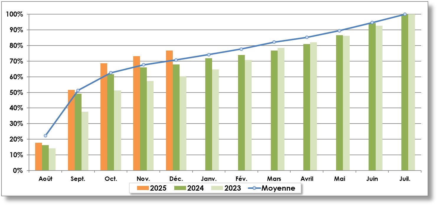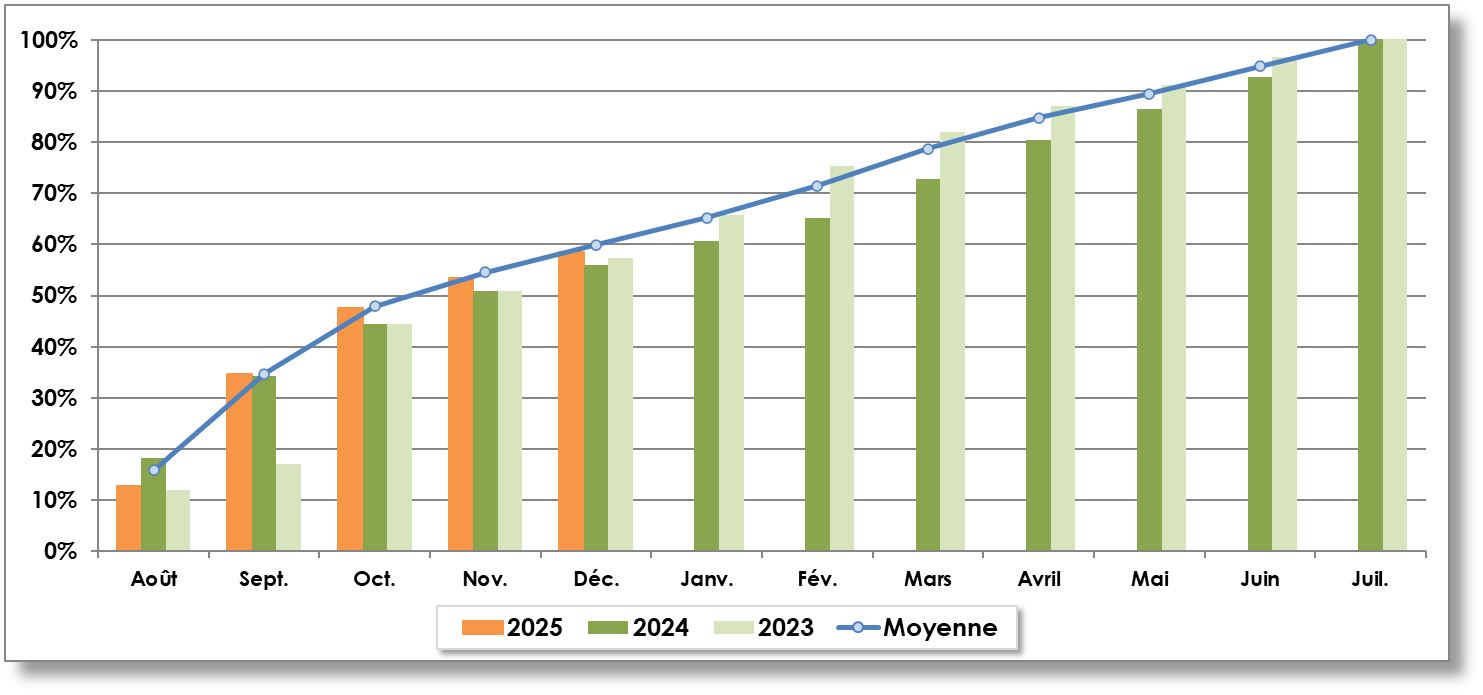 | Année récolte | Août | Septembre | Octobre | Novembre | Décembre | Janvier | Février | Mars | Avril | Mai | Juin | Juillet | TOTAL |