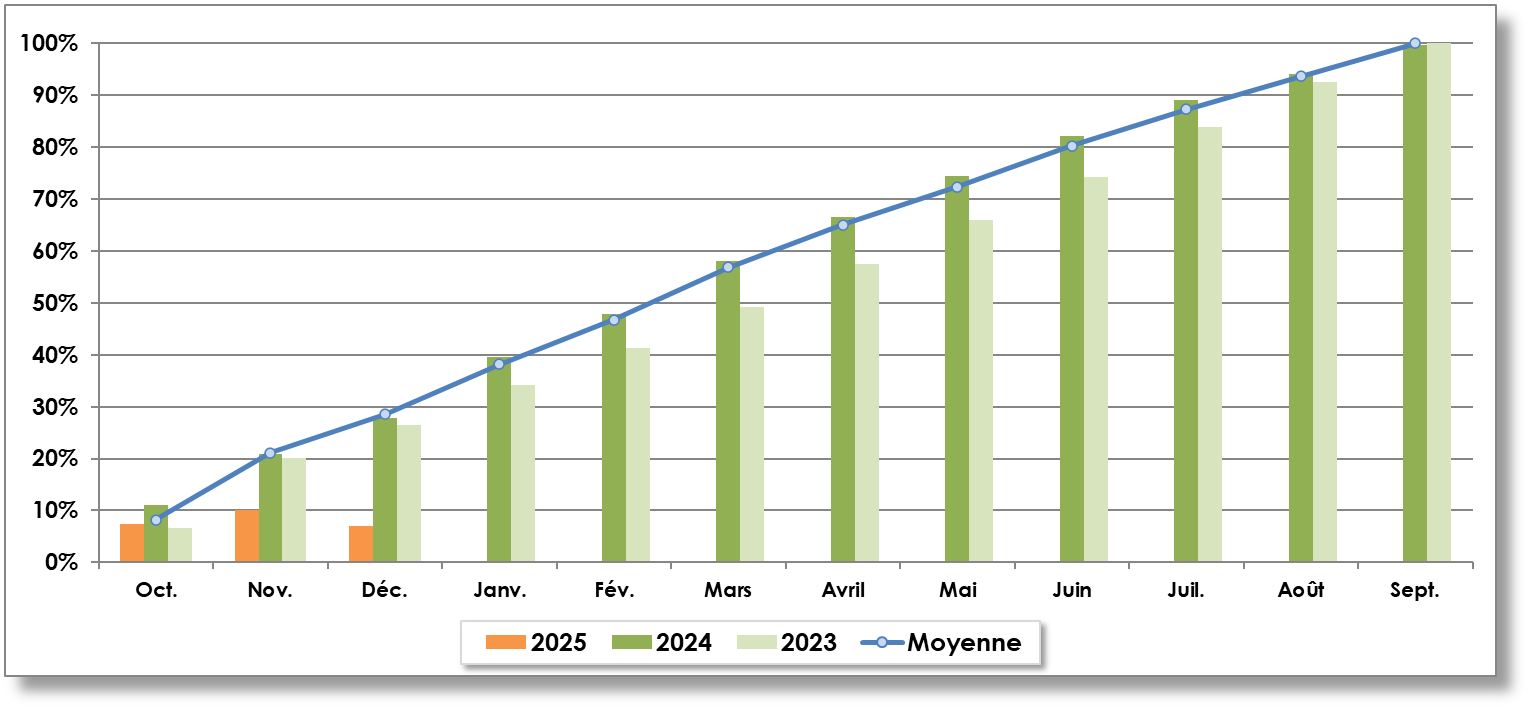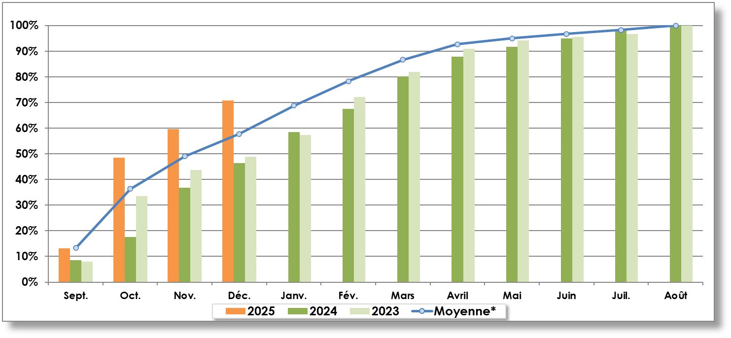 - Moyenne 5 ans (2020-2021 à 2024-2025) : 3 030 969 t