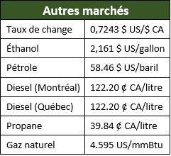 La production hebdomadaire américaine d’éthanol a baissé de 21 000 barils/jour pour s’établir à 1,11 million de barils/jour. Les stocks sont quasiment inchangés, en diminution de 1 000 barils.
