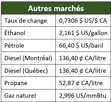 Les prévisions météo pour les quinze prochains jours demeurent favorables pour le Brésil et néfastes pour l’Argentine. Les précipitations seront de près de la normale à supérieure à celle-ci dans le centre et l’est du Brésil, et inférieures à la normale dans le sud du Brésil et en Argentine. Les pluies au Brésil devraient ralentir le battage du soya et les semis de maïs safrinha, ce qui n’est pas encore une préoccupation pour le moment, mais elles seront bénéfiques pour le maïs déjà semé. Le temps sec en Argentine devrait éventuellement réduire les estimations de production pour le maïs et le soya si cette tendance perdure. D’ailleurs, en Argentine, la condition de bonne à excellente a diminué de 8 % pour le soya et de 1 % pour le maïs, pour se situer respectivement à 32 % et 43 %. La Bourse de Buenos Aires maintient son estimation de la production de soya à 48,5 Mt, soit le même niveau que celle de l’USDA.