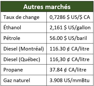 Le maïs et le blé ont clôturé en hausse, soutenus par des corrections techniques et les difficultés dans les négociations pour la paix en Ukraine, tandis que le soya a continué de baisser sous la pression des bonnes prévisions météo au Brésil. L’USDA a publié une vente de 114 000 tonnes (t) de soya pour une destination inconnue, probablement la Chine. Les ventes de soya à la Chine demeurent insatisfaisantes par rapport à l’objectif de 12 millions de tonnes (Mt) d’achats chinois. Le huard est resté stable.