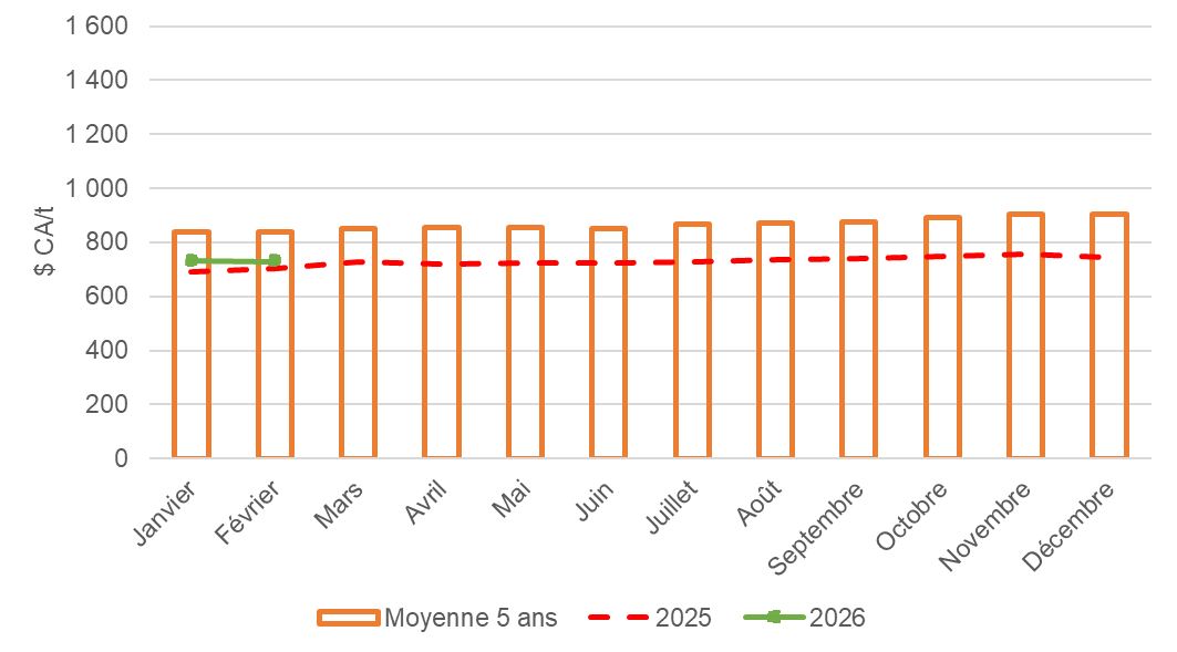 Les prix sont exprimés en dollars canadiens par tonne métrique ($ CA/t).