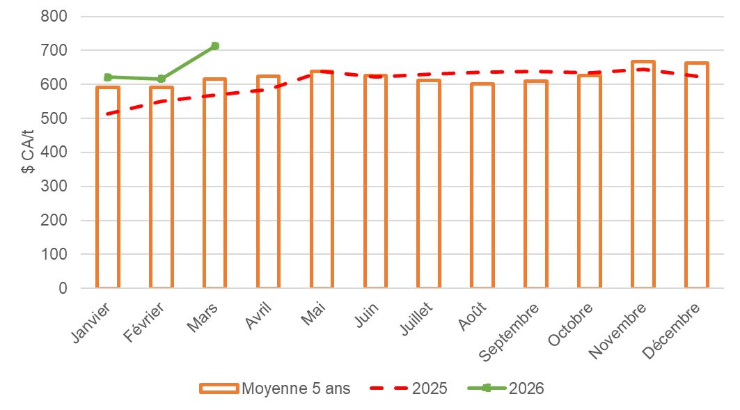 Les prix sont exprimés en dollars canadiens par tonne métrique ($ CA/t).