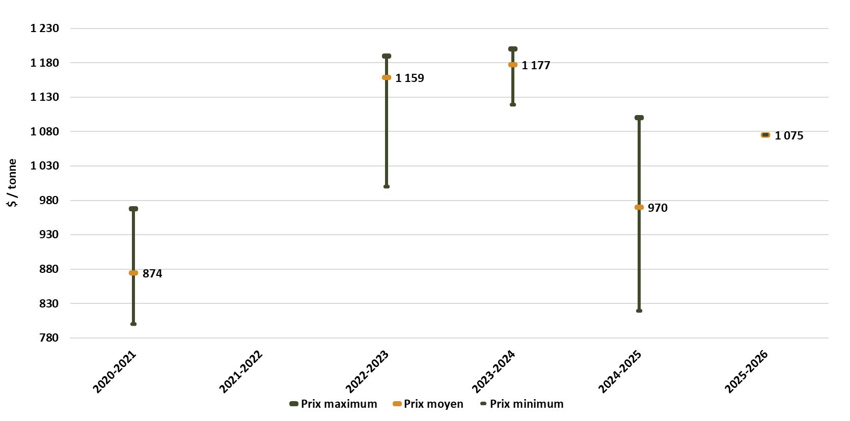 Le graphique et le tableau suivants permettent de constater la fourchette des prix dans une même année récolte.
