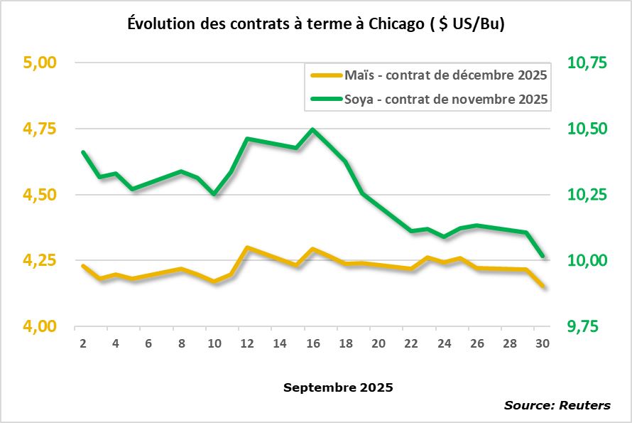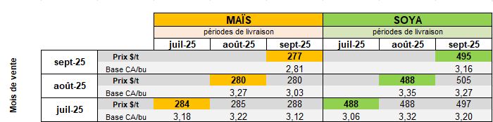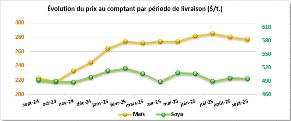 Le tableau et le graphique suivants présentent l'évolution du prix au comptant du maïs et du soya par période de livraison.