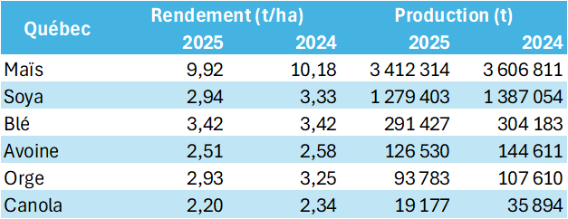 Estimations des rendements et des productions de grains au Québec en 2024 et 2025