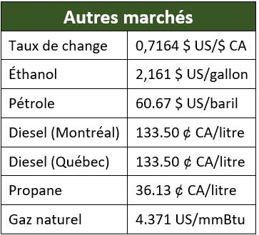 Le maïs et le blé ont terminé neutres, tandis que le soya a clôturé en baisse pour des raisons techniques alors que l’USDA a publié ce matin des ventes de 792 000 tonnes (t) de soya des États-Unis vers la Chine. Hier, en fin d’après-midi, des rumeurs ont circulé selon lesquelles COFCO, une compagnie étatique chinoise, aurait acheté au moins 14 cargos de soya des États-Unis, soit environ 840 000 t, pour livraison en décembre et janvier. Les bases payées sur des contrats de janvier 2026 se situeraient entre 2,35 et 2,40 $ US/bu pour des expéditions depuis le golfe du Mexique et entre 2,15 et 2,20 $ US/bu depuis la côte ouest, tandis que la base pour la nouvelle récolte brésilienne s’établirait à 1,25 $ US/bu. Tout porte à croire que COFCO est l’acheteur unique derrière ces transactions et que le prix n’en soit pas la raison : ces achats semblent motivés par des considérations politiques. Néanmoins, les achats chinois demeurent une bonne nouvelle et sont plus substantiels que ceux réalisés pendant la paralysie gouvernementale, ce qui devrait soutenir le soya pour un certain moment. Le huard a connu une bonne remontée, entrainé à la hausse par le pétrole brut en Bourse.