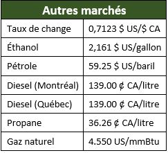 Les grains ont clôturé en baisse, menés par le soya, en raison de prises de profit, alors que l’USDA a annoncé ce matin des ventes de 330 000 tonnes de soya vers la Chine totalisant 1,12 million de tonnes (Mt) de soya en deux jours. En somme, la tendance de prix du soya demeure haussière. Cependant, la Chine devra poursuivre ses achats de soya des États-Unis si elle veut respecter son engagement d’achats de 12 Mt d’ici janvier. Le dollar canadien a été entrainé à la baisse par la dépréciation du baril de pétrole brut en Bourse en raison des efforts de Washington à mettre fin à la guerre en Ukraine.