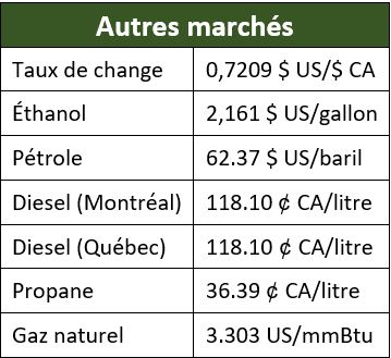 Les grains ont clôturé en baisse, sous la pression du battage aux États-Unis qui suit un rythme normal. Selon le rapport sur l’état des cultures aux États-Unis, les récoltes sont complétées à 18 % pour le maïs et à 19 % pour le soya, un retard de 1 % par rapport à la moyenne quinquennale. Les semis de blé d’automne sont terminés à 34 %, un retard de 2 % sur la moyenne des cinq dernières années. Le dollar canadien s’est maintenu alors que l’effet de la dépréciation du pétrole brut en Bourse a été compensé par l’impact de la baisse de la devise américaine.