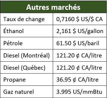 En Ontario, les récoltes sont complétées à 97 % pour le soya et à 11 % pour le maïs. Selon la Tournée des Grandes Cultures du Québec, le battage du maïs a peu progressé cette semaine en raison des pluies et le rendement serait variable. Au moins, le blé d’automne semble avoir profité de ce temps humide. Les récoltes sont terminées à 88 % pour le soya et à 8 % pour le maïs, un retard par rapport à la moyenne quinquennale de 3 % et 38 %, respectivement. Les bases pour livraison récolte ont commencé la semaine à 0,42 $ US/bu pour le maïs et à -0,41 $ US/bu pour le soya et elles l’ont terminée à respectivement 0,57 $ US/bu et -0,58 $ US/bu.