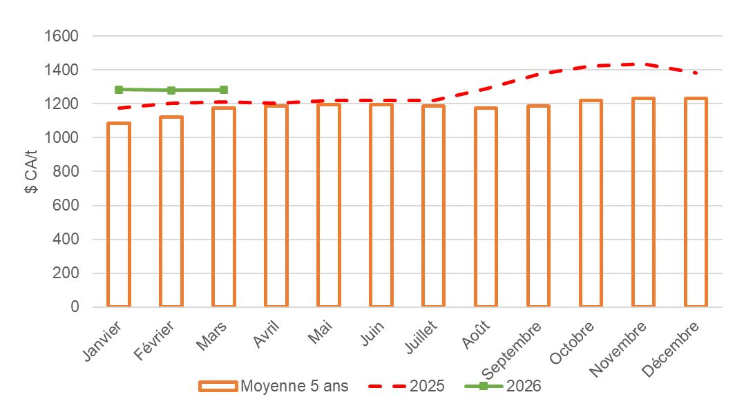 Les prix sont exprimés en dollars canadiens par tonne métrique ($ CA/t).