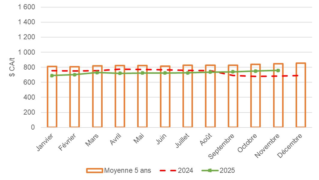Les prix sont exprimés en dollars canadiens par tonne métrique ($ CA/t).