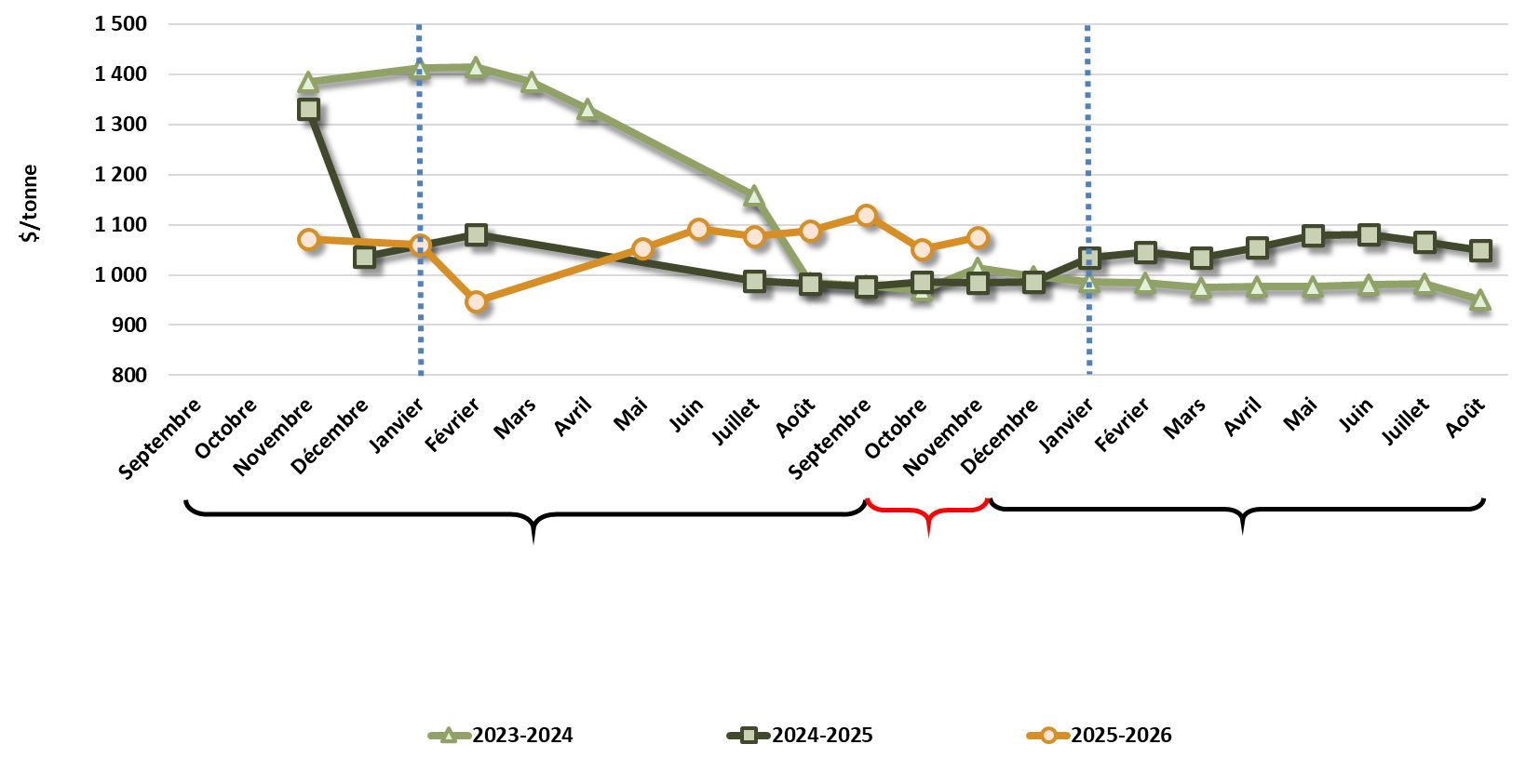 Les années récoltes analysées sont les suivantes : celle qui est récemment complétée; celle qui est récoltée, mais qui n’est pas totalement commercialisée; et celle qui n’est pas encore semée. La barre du temps couvre la période « avant récolte », « récolte » et « après récolte », pour chacune des années récoltes, car la commercialisation des grains peut s’échelonner sur 24 mois. Par conséquent, un même mois survient deux fois dans la ligne du temps. De plus, un même mois sera associé à une année différente selon l'année récolte analysée: par exemple, le mois de septembre durant la période « récolte » a lieu en 2020 pour l'année récolte 2020-2021 et en 2021 pour l'année récolte 2021-2022. Finalement, les prix sont des prix moyens pondérés qui ont été conclus durant le mois pour une livraison qui aura lieu pendant l’année récolte.