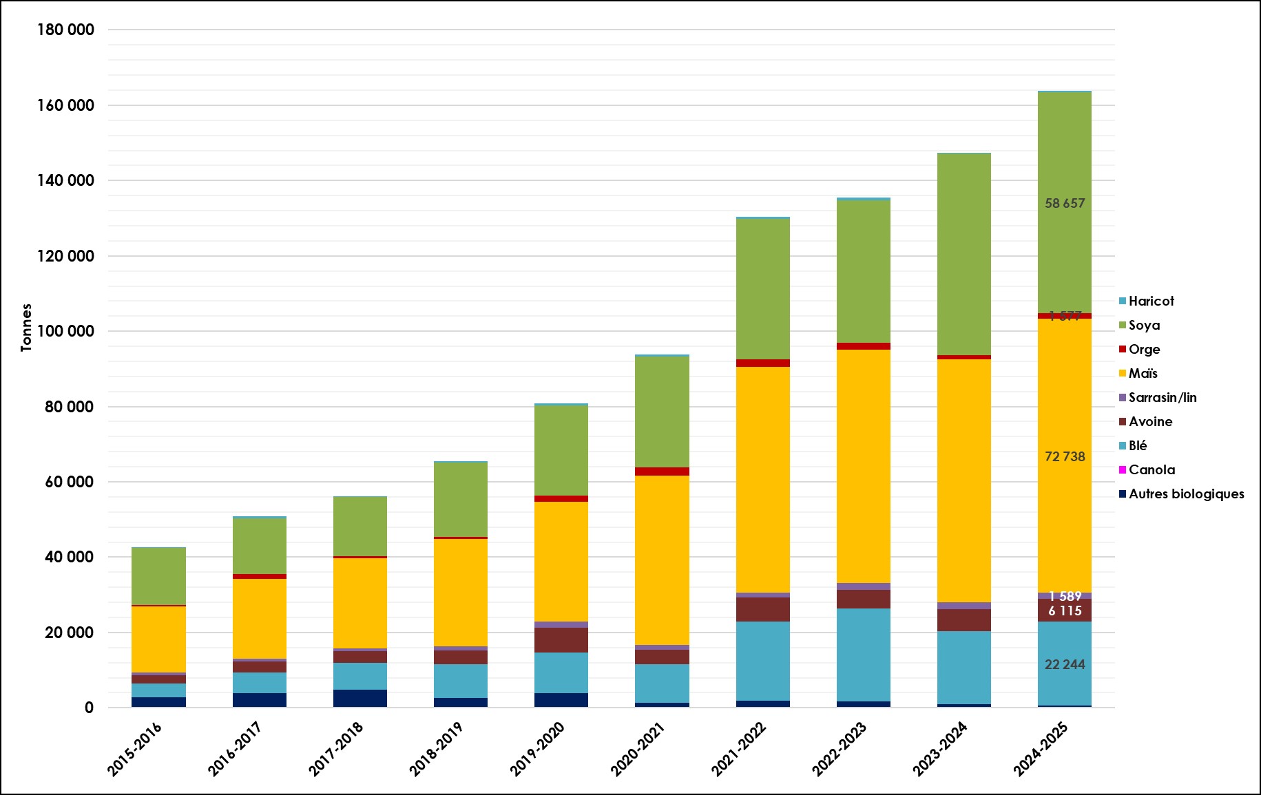 Évolution des tonnes de grains commercialisés.