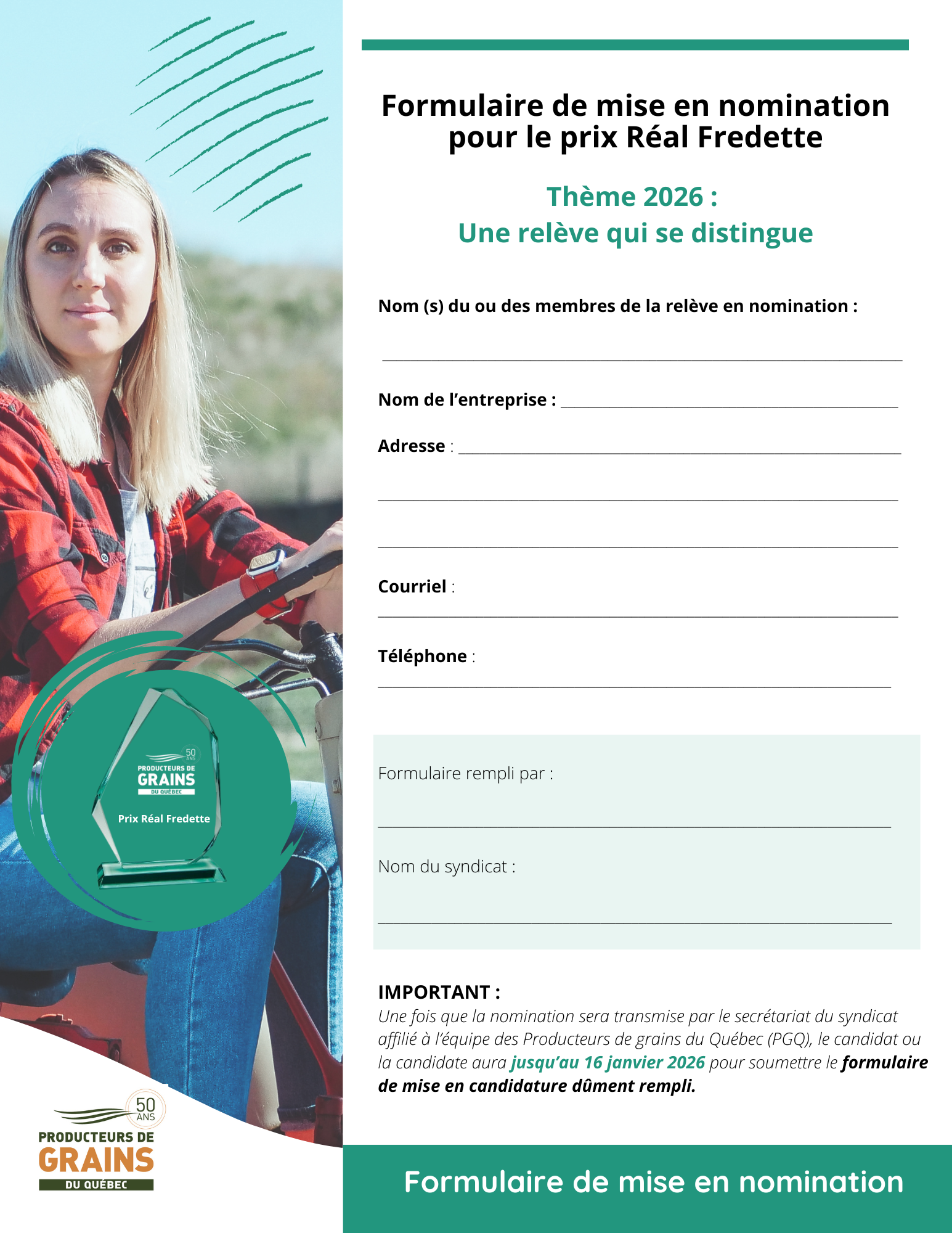 En 2026, les Producteurs de grains du Québec désirent mettre en lumière une relève qui se distingue : une relève qui saisit les opportunités ou même qui en crée, qui se donne les moyens et qui utilise pleinement les ressources mises à sa disposition, qui sort des sentiers battus, qui a un impact sur sa communauté ou sur la filière. Bref, une entreprise qui se démarque grâce à sa relève.