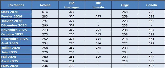 Le tableau suivant indique l’évolution du prix courant des céréales et de celui du canola au cours des derniers mois. En consultant directement les diffusions du marché local, vous pourrez observer les prix minimums et les maximums.
