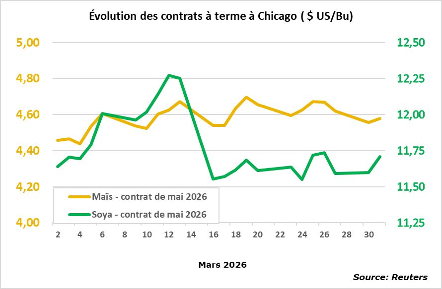La rencontre entre Trump et Xi, initialement prévue le 31 mars au 2 avril, a été reportée au 14 au 15 mai en raison du conflit en Iran. Les marchés anticipaient ce face-à-face entre les dirigeants des deux plus grandes puissances économiques mondiales, particulièrement ce qui concerne l’avenir des engagements d’achats chinois de soya américain de 20 Mt, dans un contexte d’invalidation des tarifs réciproques américains.