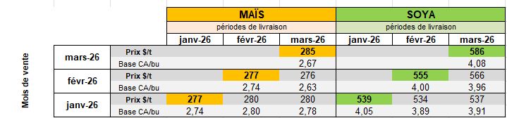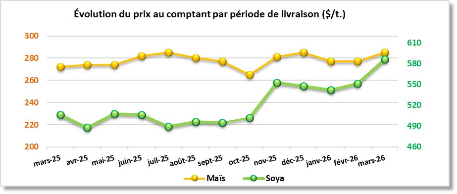 Le tableau et le graphique suivants présentent l'évolution du prix au comptant du maïs et du soya par période de livraison.