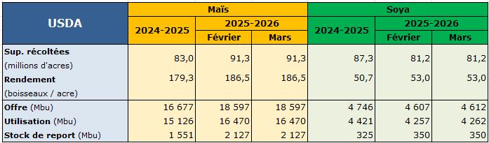 Les stocks de grains au 1er mars s’élevaient à 9,02 milliards de boisseaux (Gbu) pour le maïs, de 2,10 Gbu pour le soya et 1,30 Gbu pour le blé. Comparativement à l’an passé, cela représente des hausses respectives de 10,8 %, 10,1 % et 5,1 %. Les stocks de 2026 par rapport à ceux de 2025 sont prévus augmenter de 37,1 % pour le maïs, 7,7 % pour le soya et 8,8 % pour le blé.