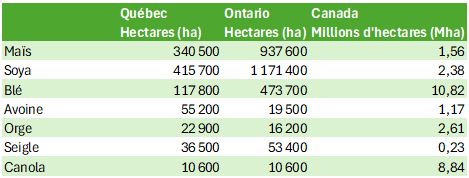 Tableau sur les superficies ensemencées au Québec, en Ontario et au Canada en 2026