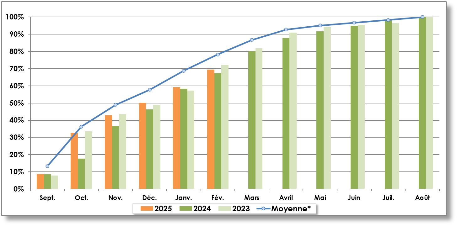 - Moyenne 5 ans (2020-2021 à 2024-2025) : 3 032 292 t