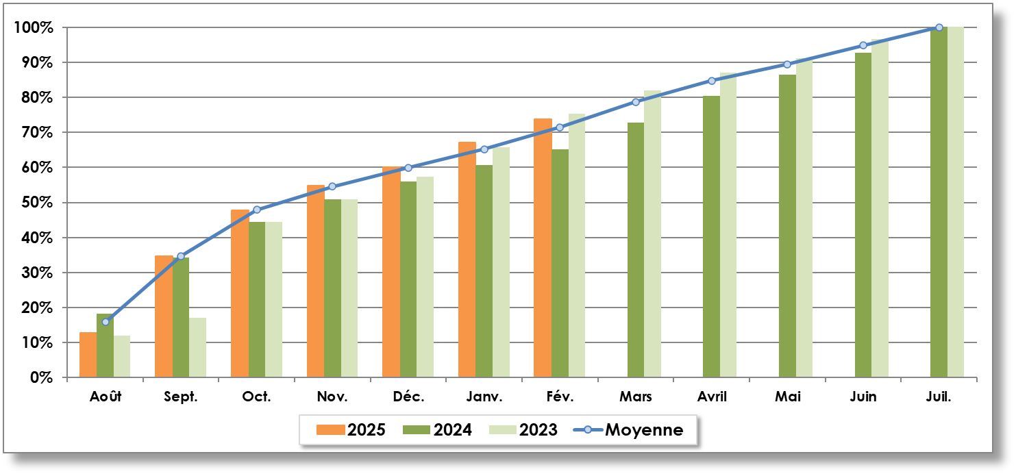 | Année récolte | Août | Septembre | Octobre | Novembre | Décembre | Janvier | Février | Mars | Avril | Mai | Juin | Juillet | TOTAL |